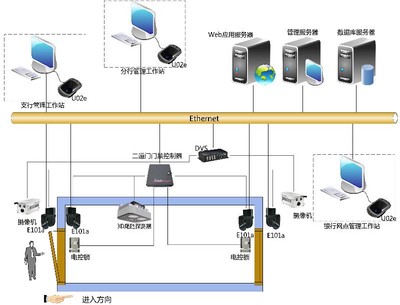 8、对于银行外协软硬件维护人员、库包现金押运人员等外来人员,经管理员授权后,系统支持临时注册用户,可以在二道门上进行手掌认证开门(或内部人员确认后手动开门)。系统管理员可以为每一个临时的用户设置时效,当这部分人员离开营业网点时,其进出权限过时自动失效,从而为银行管理提供了更加安全、高效的时段控制和网络监测、管理、统计功能。